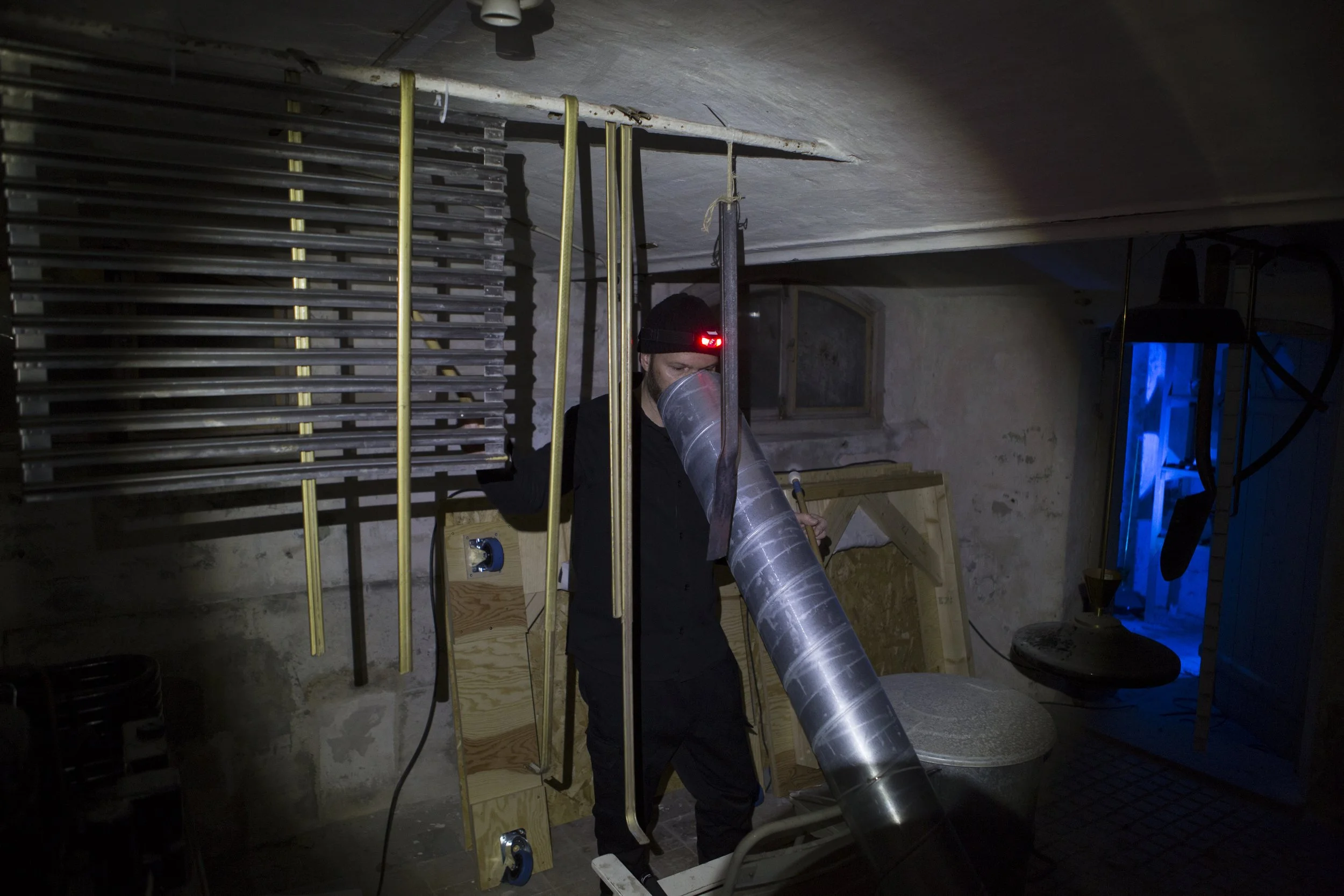 Industrial percussion performance. ImproStunt 2021 @Rotvoll Kunstnerkollektiv, Trondheim. With Sissel Vera Pettersen & dance artists Anna Thu Schmidt, Nina Wollny, Karoline Ellingsen Wheeler. Photo: Tobias Liljedal